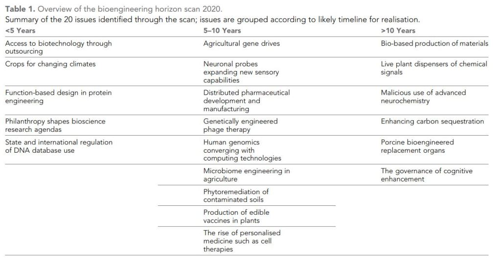 In the 2020 horizon scan, newly highlighted issues includes topics spanning from the political (the regulation of genomic data, increased philanthropic funding and malicious uses of neurochemicals) to the environmental (crops for changing climates and agricultural gene drives). The 20 topics are grouped into issues that are expected to be most relevant within five years, within 5–10 years, and on timescales of longer than 10 years (see table).