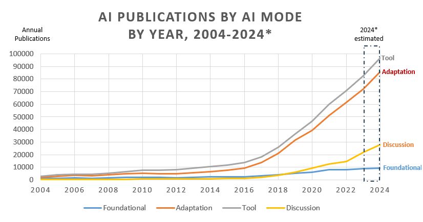 Note. The figure in this post is an elaboration of the work presented in the preprint. It shows overall worldwide trends, drawing on our analysis of OpenAlex publications (N of AI records, 2004-2024* = 1,075,782). *2024 is estimated by exponential regression over prior 3 years as 2024 records are not complete in our May 2025 OpenAlex snapshot.